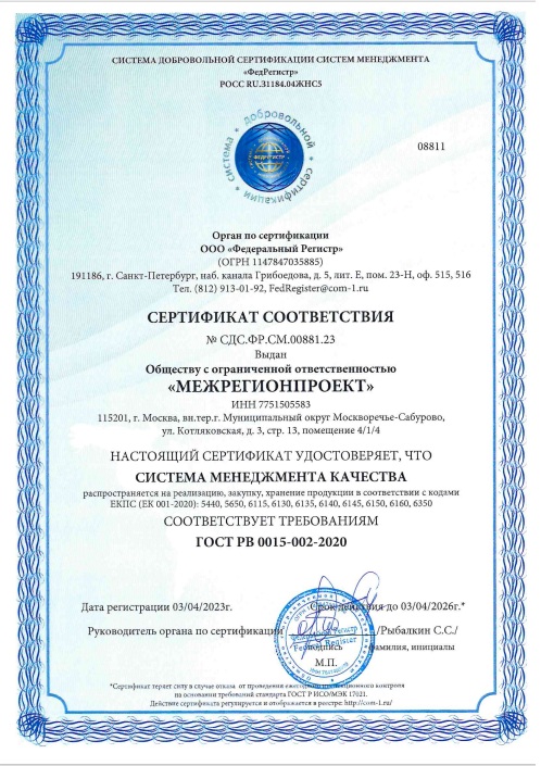 Сертификат соответствия системе менеджмента качества ГОСТ РВ 0015-002-2020